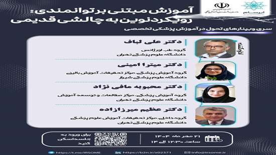 دبیرخانه شورای آموزش پزشکی و تخصصی در نظر دارد سلسله و بینارهایی را تحت عنوان کلی تحول در آموزش پزشکی تخصصی برگزار کند. دومین و بینار از این سلسله وبینارها، روز دوشنبه مورخ ١٤٠٤/۷/۲۱ از ساعت ۱۲:۳۰ لغایت ١٤ با عنوان آموزش مبتنی بر توانمندی رویکرد نوین به چالش قدیمی برگزار میگردد. همکاران میتوانند با اسکن کردن QR کد روی پوستر پیوست در این و بینار شرکت نمایند.